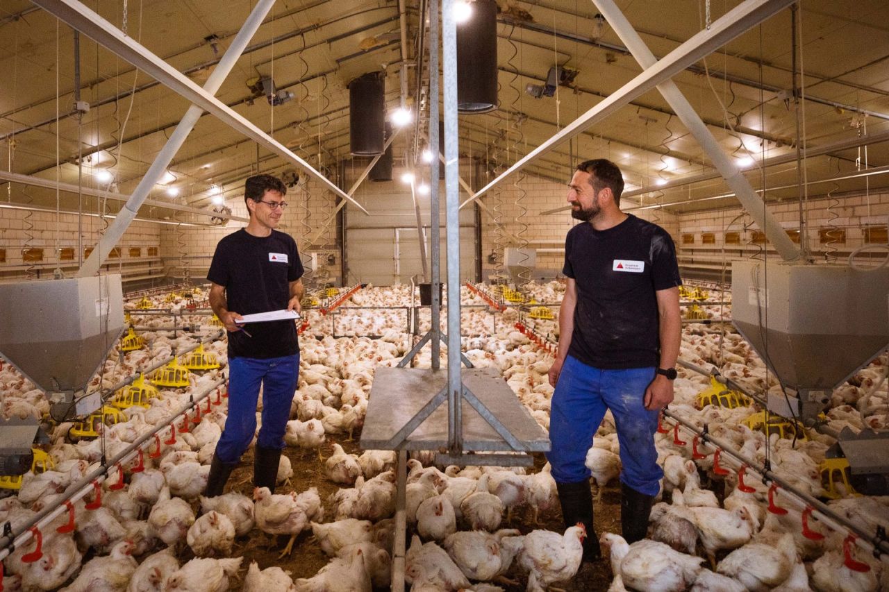 Martijn Chombaere (Landsbond Pluimvee) en Wouter Wytynck (Boerenbond) bespreken de actualiteiten in de vleeskippenhouderij