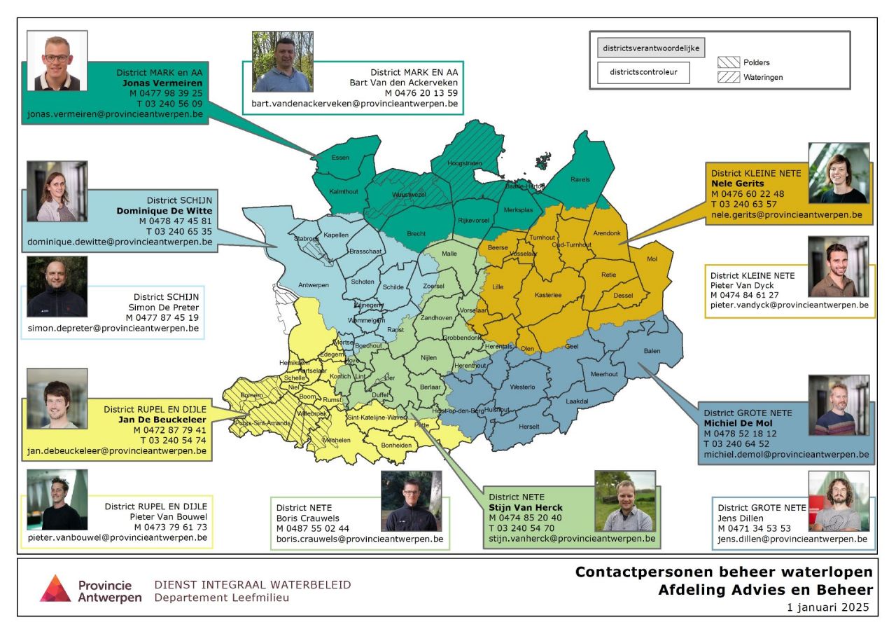 Om het beheer van onze 2.400 kilometer waterlopen in goede banen te leiden, hebben we onze provincie onderverdeeld in 6 districten. In elk district zorgen een verantwoordelijke en een controleur voor het dagelijkse beheer en de advisering en opvolging van bouwdossiers. Heb je vragen over het onderhoud van een waterloop? Wil je een brug bouwen? Vraag je je af welke aanplantingen je naast de waterloop mag doen? Onze medewerkers helpen je graag verder.