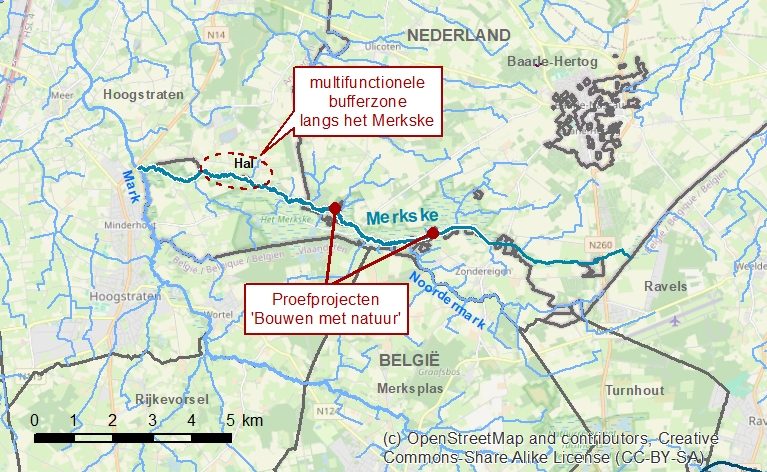 Samen met de Nederlandse collega's van Waterschap Brabantse Delta wil de provincie Antwerpen de waterkwaliteit en biodiversiteit in het Merkske verbeteren. We willen er voor zorgen dat er ook in zeer droge periodes nog voldoende water door de beek stroomt, zonder de afvoer bij hoogwater te verhinderen. Daarvoor gaan we kleinschalige 'bouwen met natuur'-maatregelen toepassen. Om meer water vast te houden in droge periodes kunnen we lage takkenbossen in de beek leggen, het beheer gericht aanpassen en met zand de beekbodem verhogen. Met extra beplanting langs de beek zorgen we voor voldoende schaduw.