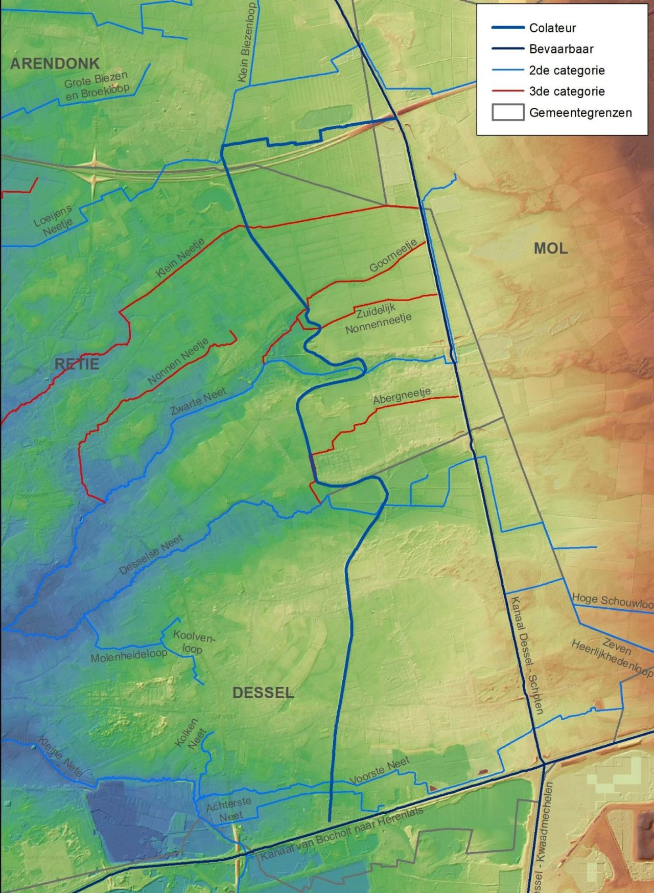 De gracht werd ook een tijd gebruikt als doorvoer tussen het kanaal Dessel-Schoten en het kanaal Bocholt-Herentals. Tot in 1935 de scheepvaart nood had aan een ander kanaalpeil en de monding van de Colateur moest wijken. Voortaan kwam hij uit in de Achterste Neet en sinds 2021 in de Voorste Neet.