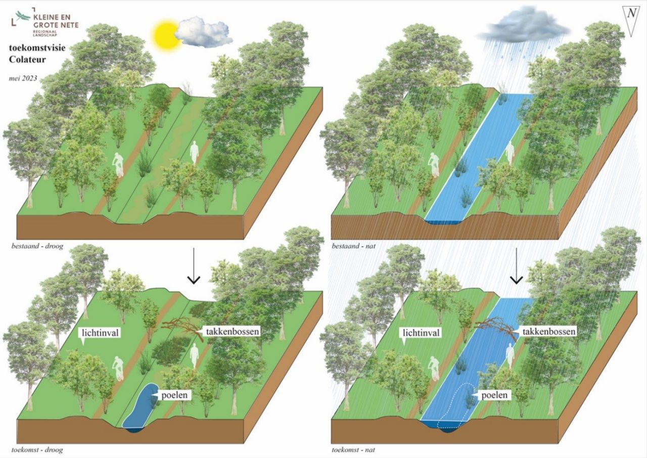 De integrale visie focust op spaarzaam en weldoordacht omgaan met het beschikbare water. Verder streeft de visie naar een ecologisch en recreatief aantrekkelijke Colateur. We creëren bijvoorbeeld meer lichtinval in de groenstroken wat de ontwikkeling van water- en moerasvegetatie zal stimuleren. Door plaatselijk hout aan te brengen in de waterloop zorgen we dan weer voor meer structuurvariatie.