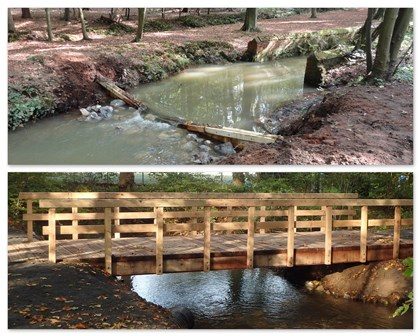 Die brug hebben we trouwens ook vervangen. De oude brug liet het water maar moeilijk passeren en bovendien was hij al een tijdje in slechte staat. Nu ligt er een fonkelnieuw exemplaar in duurzaam hout, dat door het principe 'dek op oevers' de beek vrije doorgang geeft. De mooie nieuwe brug is zeker een meerwaarde voor deze drukke wandel- en fietsweg door het Peerdsbos!