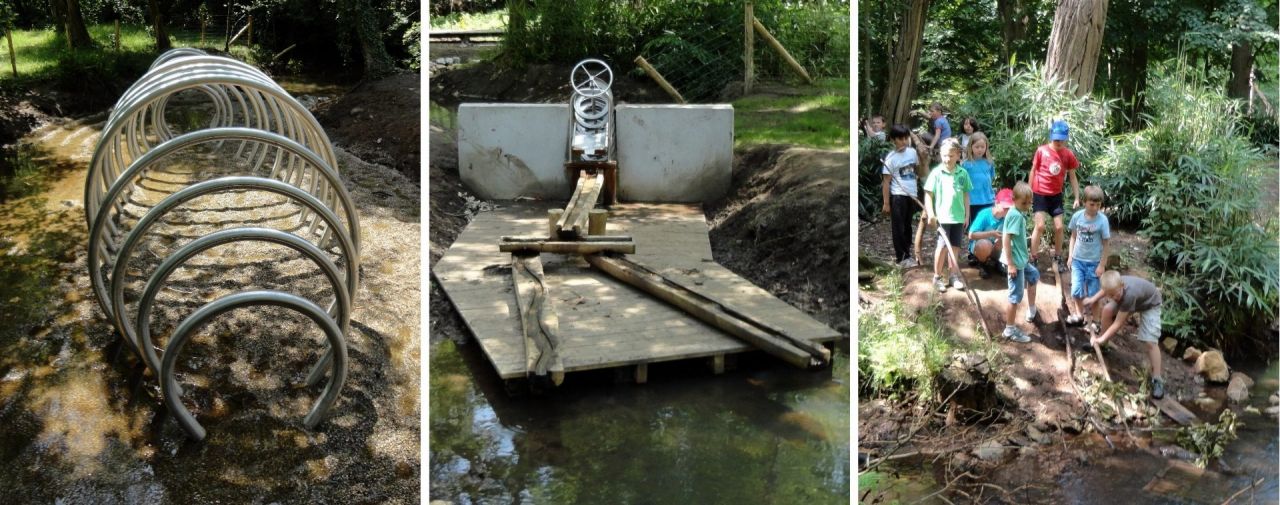De oude vistrap vormden we om tot een educatieve speelzone. Je vindt er een schat aan informatie over vismigratie, beekherstel en beschermde vissoorten zoals de rivierdonderpad. Je kunt er ook zelf aan de slag: probeer maar eens met de schroef van Archimedes water naar de watertafel te pompen! Hier zie je wat het verschil is tussen een meanderende en een rechtgetrokken geul en hoe het water erdoor loopt. Daarna stroomt het verder naar de speelvis, een toffe speelplek in de beek. Op warme dagen een verfrissing voor lichaam en geest!