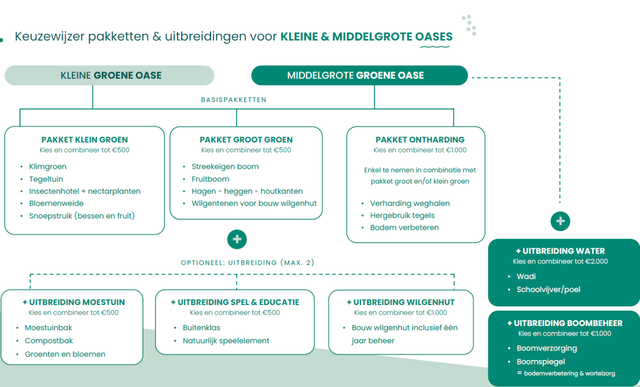 Deze keuzewijzer toont de basis- en uitbreidingspakketten die je kan kiezen bij je Kleine Groene Oase. Voor elk pakket kan je de inhoud op maat van je school samenstellen. Je Regionaal Landschap adviseert je bij de ideale samenstelling voor jullie project.