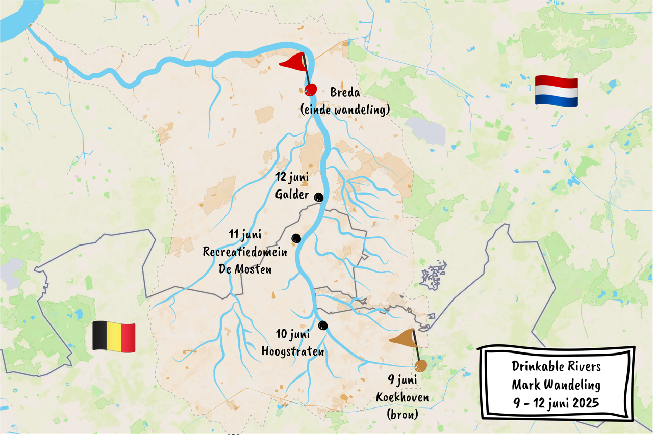 Zou je ooit kunnen zwemmen in de Mark? Of zelfs ervan drinken? Die droom leeft bij velen. De waterloop ontspringt in de Antwerpse Kempen en zet nadien zijn weg verder via Merksplas en Hoogstraten naar het Nederlandse Breda. Tijdens een vierdaagse rivierwandeling langs de Mark werd duidelijk dat steeds meer partners – over grenzen en sectoren heen – aan deze droom samenwerken. Want een gezonde rivier begint bij gedeelde verantwoordelijkheid. Geïnspireerd door Li An Phoa en haar organisatie Drinkable Rivers, die al jaren mensen samenbrengt via rivierwandelingen, vond ook in juni een verbindende tocht langs de Mark plaats: van bron tot Breda, langs vier etappes vol ontmoeting, meting en actie.