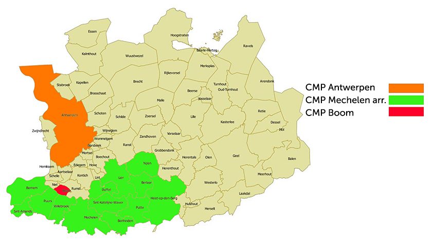 Binnen de provincie Antwerpen zijn, met ingang vanaf 1 september 2019, drie Centrale Meldpunten actief: naast CMP Antwerpen, dat reeds meerdere jaren operationeel is, starten CMP Boom en CMP Mechelen Arrondissement. Elk CMP is actief binnen een welbepaald werkingsgebied