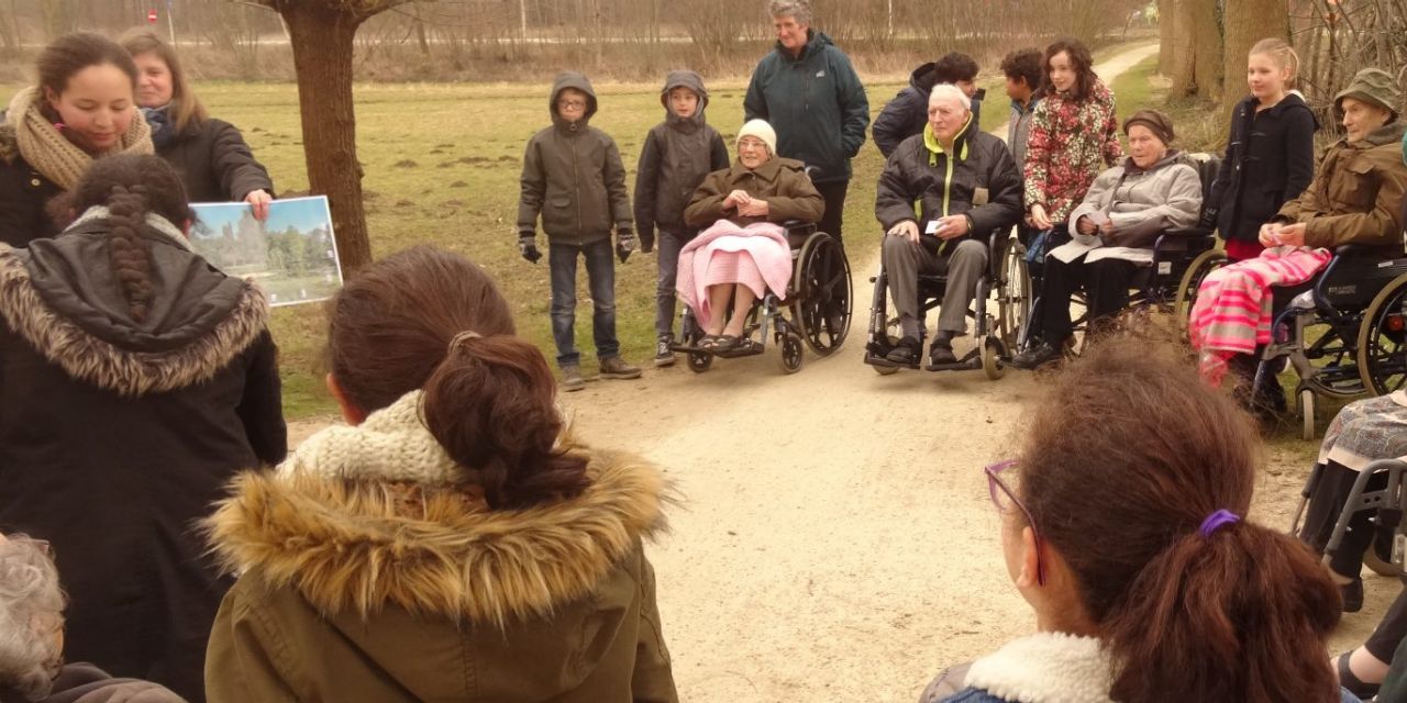 Leerlingen van de derde graad van het basisonderwijs en bewoners van een woonzorgcentrum maken samen een wandeling in het park Rivierenhof onder begeleiding van een natuurgids.