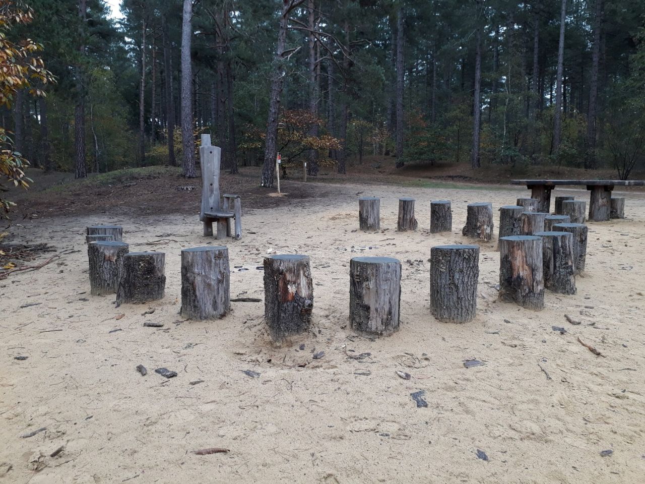 Er is een speelzone, een zandplek, zitstammen in een kring en meerdere picknickplaatsen. Alles is in openlucht.