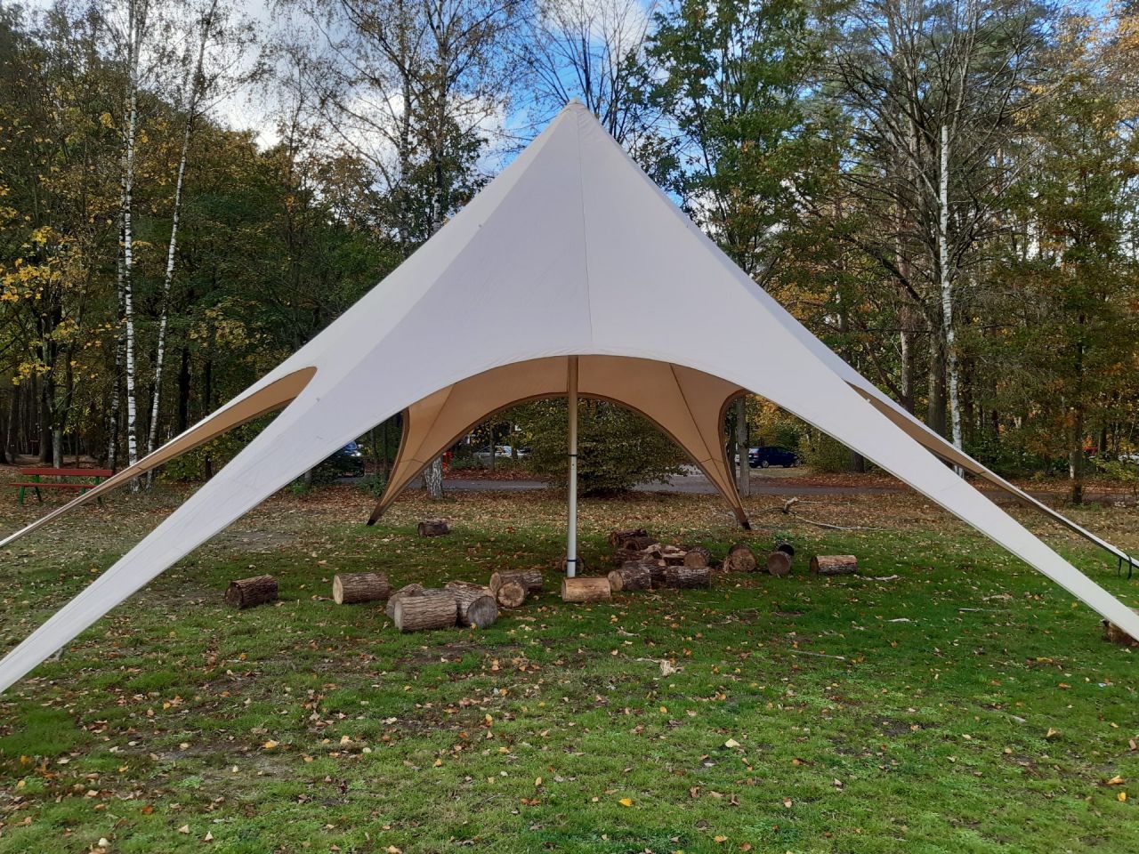 Twee grote stertenten en 1 kleine stertent zorgen voor schaduw en beschutting voor 75 leerlingen. De bankjes staan in U- of kringopstelling.