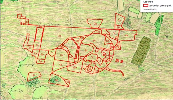 Uittreksel uit de Ferrariskaart (ca. 1775) waarop de bestanden van het huidige Prinsenpark geprojecteerd zijn. Het gebied bestaat bijna volledig uit heide (met linksonder enkele vennen).