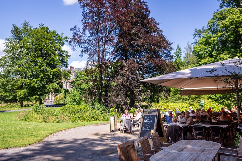Je zit midden in het park met zicht op het kasteel. Genieten van een hapje of drankje kan op het terras of lekker warm binnen.
