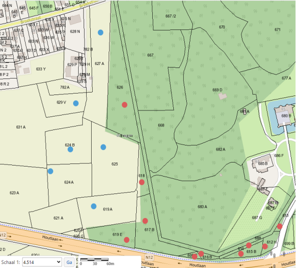 De percelen met een rode stip zijn kadastraal gekend als Wijnegem, 1ste afdeling, sectie A, nummers 626, 618, 619E, 617B, 608C, 616B, 614, 615B, 612H en 613. De percelen zijn volgens het gewestplan gelegen in natuurgebied en hebben een totale oppervlakte van 26.954 m².