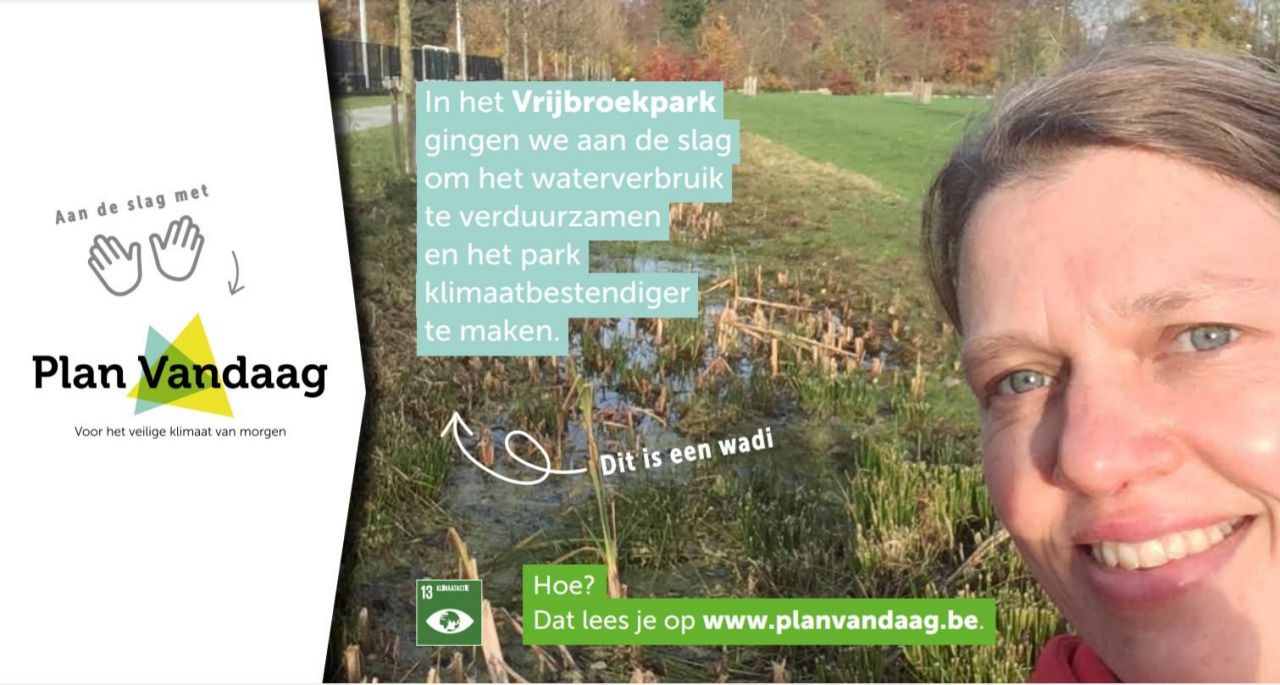 Vandaag toont Sarah Wouters je hoe het Vrijbroekpark weer een beetje klimaatneutraler en -veiliger werd met behulp van een wadi. Want van onze organisatie een klimaatneutrale en -veilige plek maken, dat is één van de hoofddoelen van Plan Vandaag.
