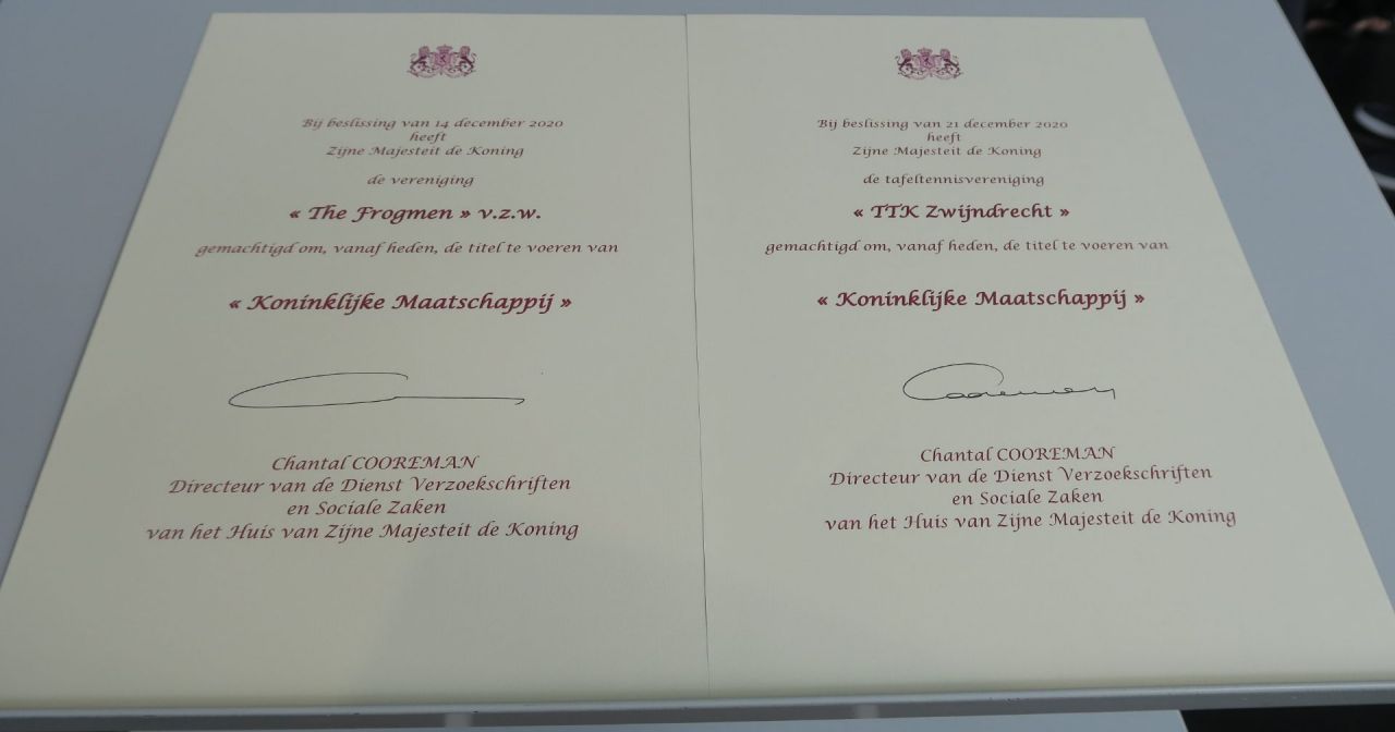 Op maandag 4 oktober ontving gouverneur Cathy Berx twee verenigingen die vijftig jaar of langer bestaan en om die reden voortaan de titel Koninklijke mogen voeren in het Provinciehuis. Dit keer was het de beurt aan Duikclub The Frogmen uit Borsbeek en Tafeltennisclub Zwijndrecht. Na een korte toespraak, kreeg de voorzitter van elke vereniging het officiële brevet door de gouverneur uitgereikt.
