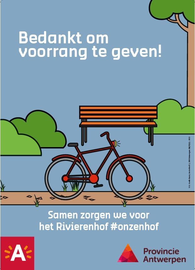 Recent liep er in het Te Boelaerpark de campagne ‘Voorrang verlenen en trager fietsen’. Op suggestie van één van de buren van het Rivierenhof stelden buurtregisseurs Ignace Bruggeman en David Hilderson aan het Rivierenhof voor om de campagne ook hier te laten lopen. Verdyck: “Zo’n samenwerking leek ons meteen een goed idee. Ook het district Deurne en politiezone Antwerpen ondersteunen ons hierbij.”
