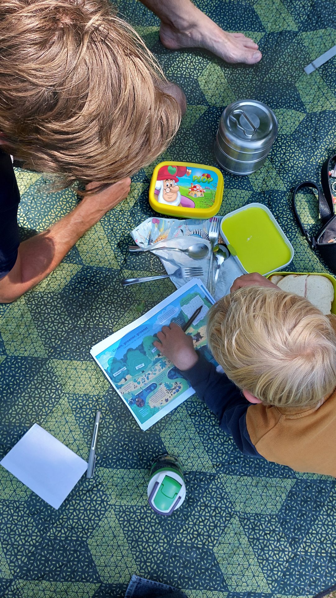 Mijn man en ik hadden een woensdag vrijaf. Het was prachtig picknickweer, dus besloten we om in de namiddag met het gezin het doe-boek van 'Expeditie Rivierenhof' onder de loep te nemen. We pakten onze picknick in, haalden de jongens van school en vertrokken meteen richting Rivierenhof. De jongens, dat zijn onze zonen Rune (6 jaar) en Senne (net 5 jaar). Senne was meteen in de auto in slaap gevallen en besloot om een groot deel van de namiddag zo verder door te brengen. Al slapend in de buggy dus.