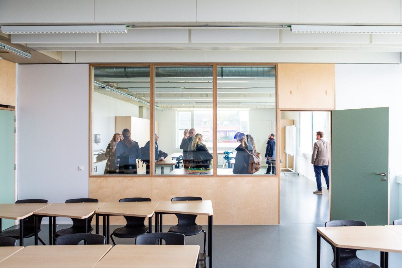 “We vonden het belangrijk dat zowel leerlingen als leerkrachten zich hier goed voelen en zin krijgen om samen te leren en experimenteren in de praktijklokalen. Vandaar ook de nabijheid tussen theorie- en praktijklokalen”, licht Technisch directeur Kathleen Massant toe. “Er was bovendien ook oog voor detail. Zo vind je bijvoorbeeld kleine knopjes op de armleuning naar gelijkenis met deze van de statige trap in het oudste gebouw, een erfgoedmonument; het is evenwel ook een praktisch element om te verhinderen dat jonge pubers zomaar naar beneden glijden.”