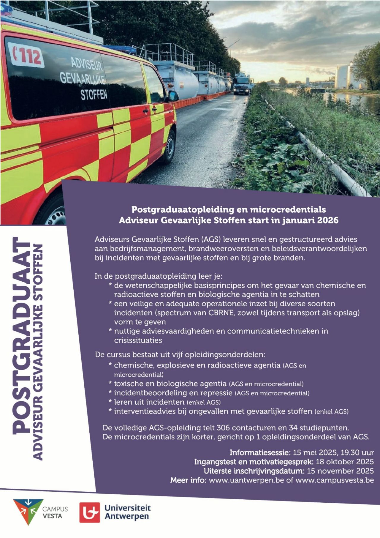 Naast de postgraduaatopleiding AGS gaan we in januari 2026 ook van start met microcredentials van AGS. De microcredentials hebben tot doel om specifieke competenties te trainen gerelateerd aan AGS voor medewerkers die betrokken zijn bij incidentbestrijding (bv. noodplanners, QHSE medewerkers, enz.).