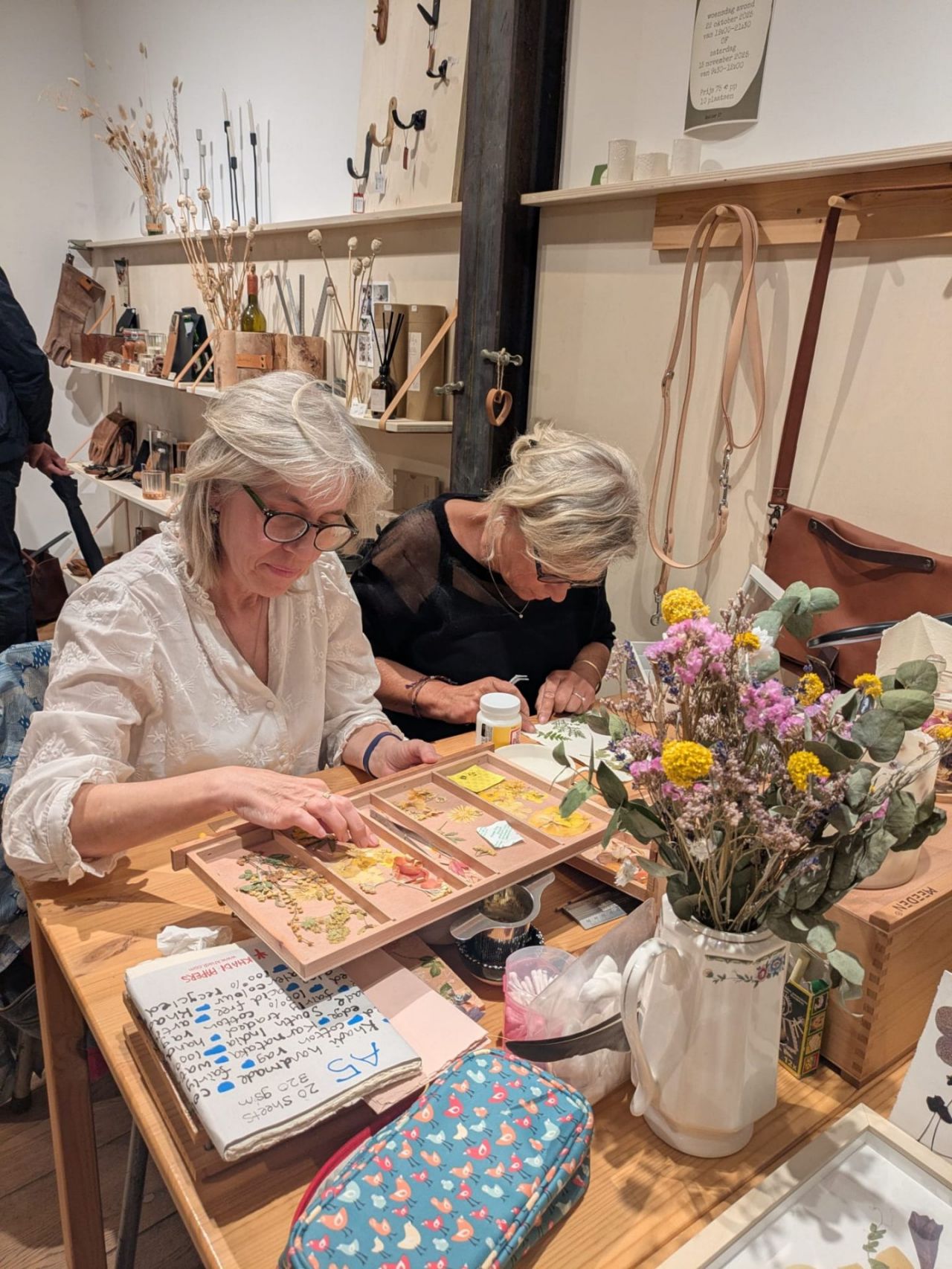 Zelfgemaakte kaartjes met gedroogde bloemen en decorative zelfgemaakte dingen, zoals hangers met bloemen en kransen.