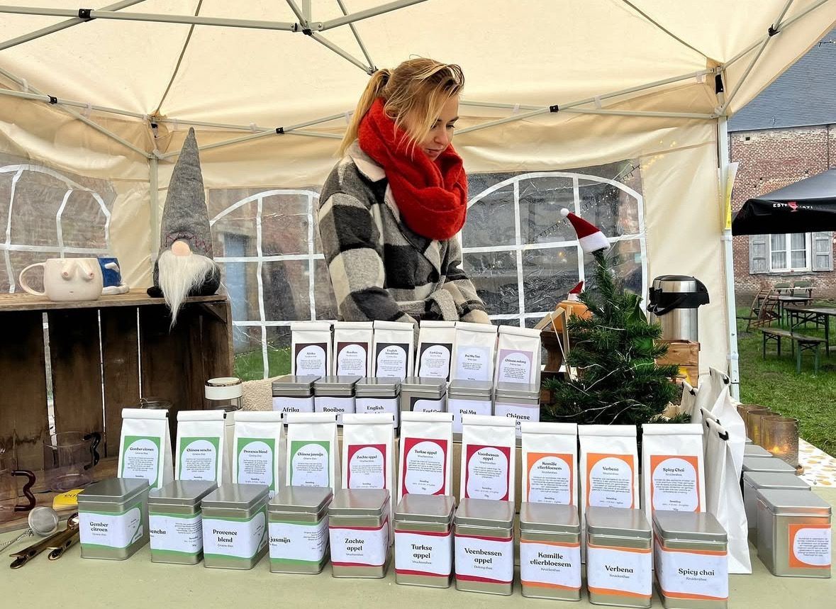 Een kleurrijke stand met ecologisch verpakte bio en fairtradeproducten. Losse thee, koffiebonen, kopjes, mokken, theepotten, matcha-set. Proevertjes: koffie en thee.