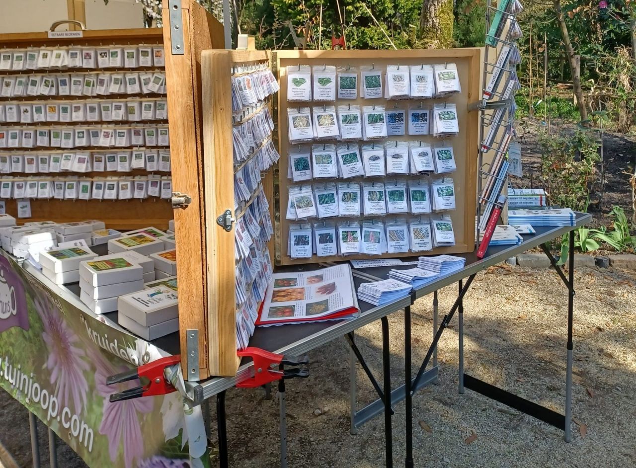 Zaden, planten, kaarten en boeken van vooral eetbare bloemen, maar ook groente en inheemse kruiden. Mini kweektrays, gieters, schepjes, ...