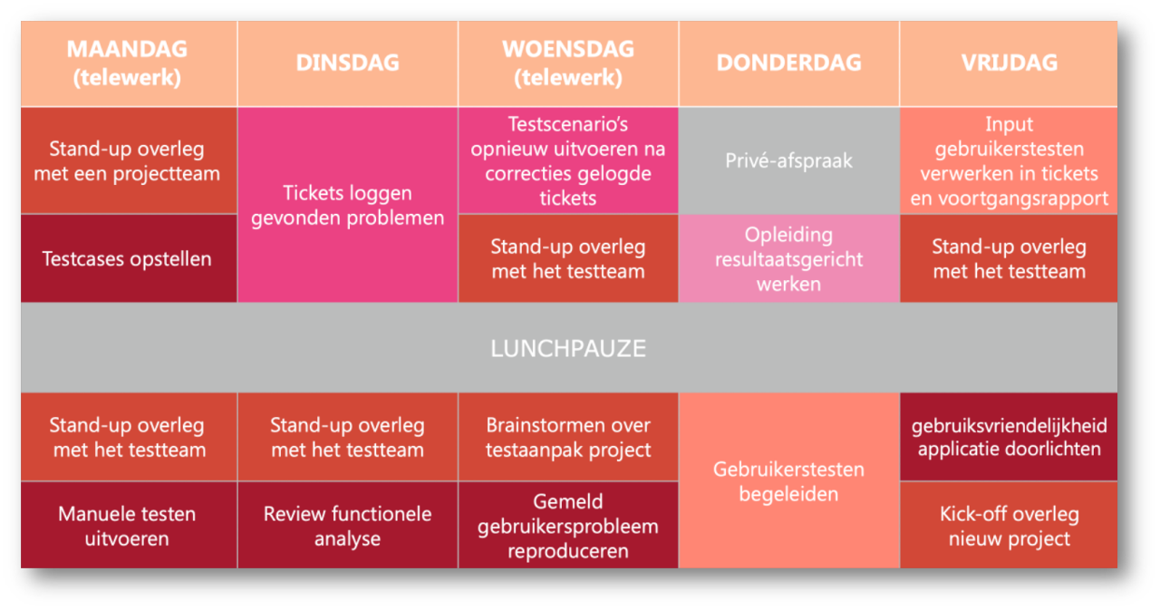 Hoe kan een toekomstige werkweek als softwaretester eruit zien? Wel, zo dus! Weet dat je bij de provincie Antwerpen flexibel werkt en zo ook je privéleven optimaal organiseert. Wanneer je jouw werkdag start, even pauzeert of eindigt, plan je zelf met oog voor continuïteit van de algemene dienstverlening.