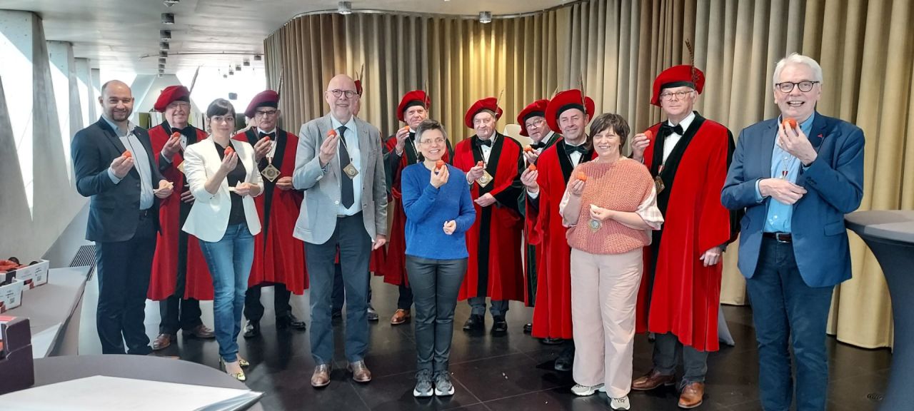 Het 'Hertogelijk Genootschap van de Ghesellen van de Aardbei' heeft op donderdag 24 maart de eerste aardbeien van de nieuwe teelt van Coöperatie Hoogstraten geschonken aan gouverneur Cathy Berx en aan de deputatie.