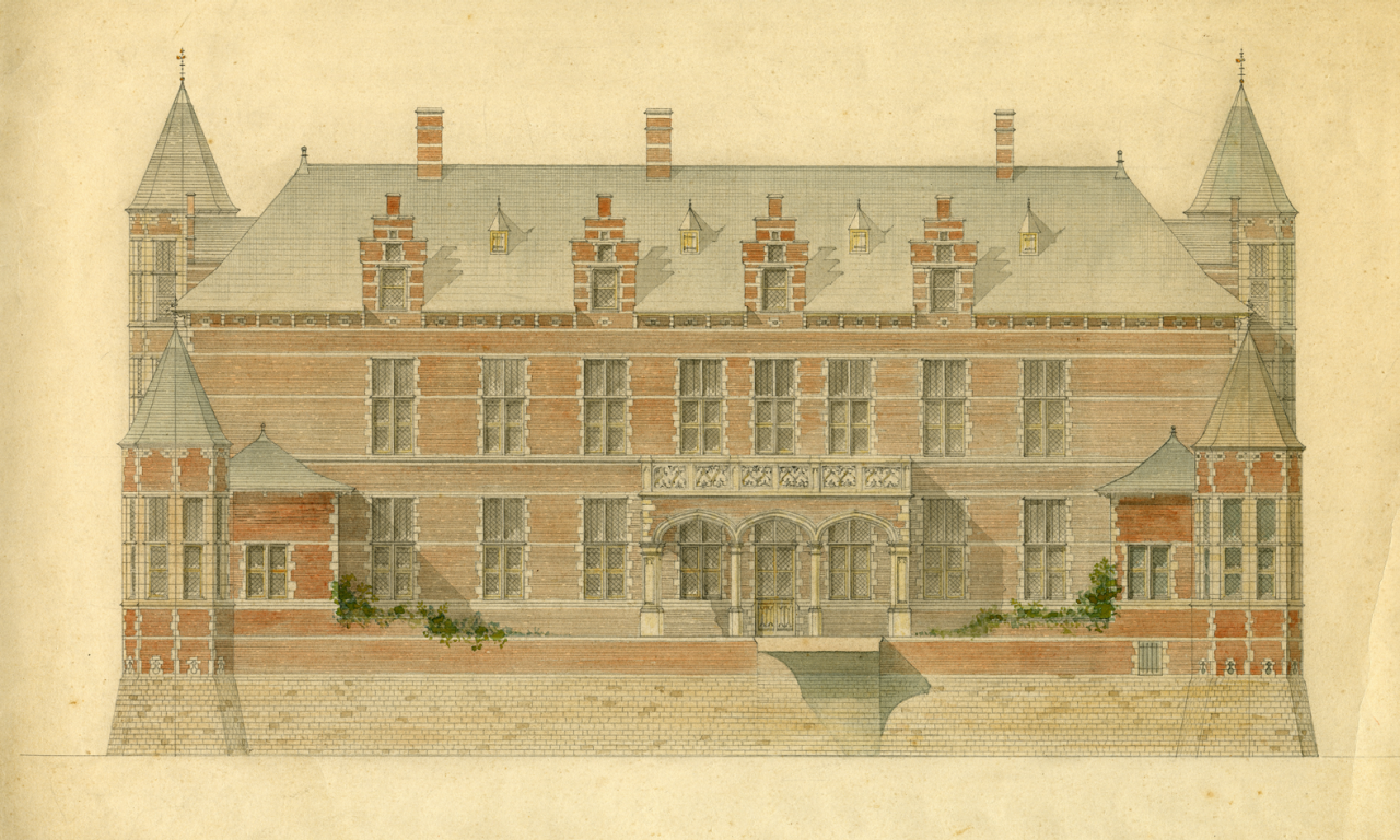 Onlangs kon het Architectuurarchief twee ingekleurde pentekeningen verwerven. Ze stellen de voor- en achterzijde van een kasteel voor. Het gaat om presentatietekeningen, een type tekening waarmee de architect zijn ontwerp duidelijk maar ook zo voordelig mogelijk wou in beeld brengen voor zijn opdrachtgever.