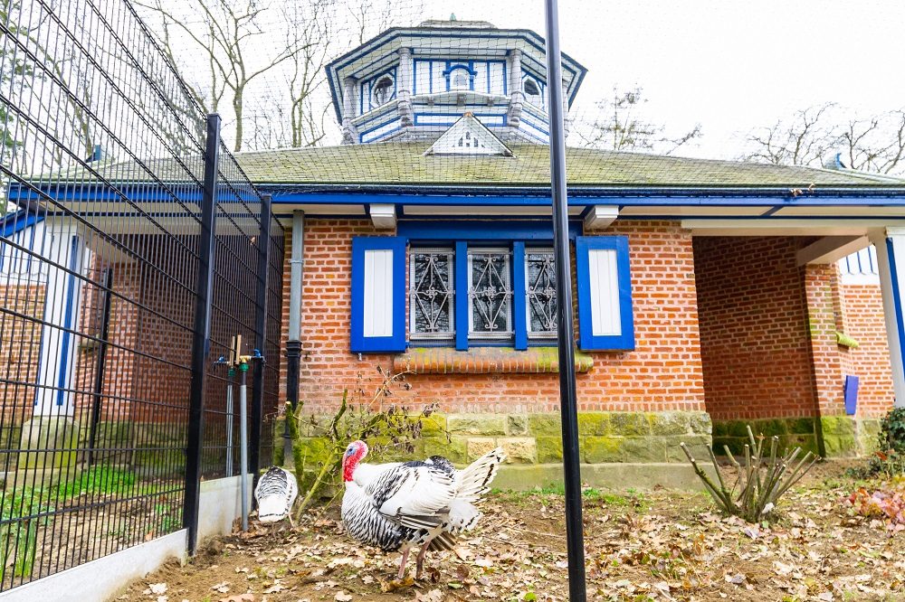 De huidige volière achter de parkvilla werd in 1922 gebouwd als pluimveepaviljoen bij de toenmalige landbouwhuishoudschool voor meisjes. De parkvilla was ingericht als landbouw- en huishoudschool, nu vind je er het infopunt Domeinwacht. In de tuin zette men de blauwwitte vogelkooi waar de 23 meisjes pluimvee leerden houden. Het gebouwtje in eclectische stijl is na 100 jaar nagenoeg ongewijzigd. De uitloopzone heeft verschillende vormen gekend en was tot voor kort verdwenen. Binnen zijn zes verschillende hokken om erfgoedkippen te houden en kweken.