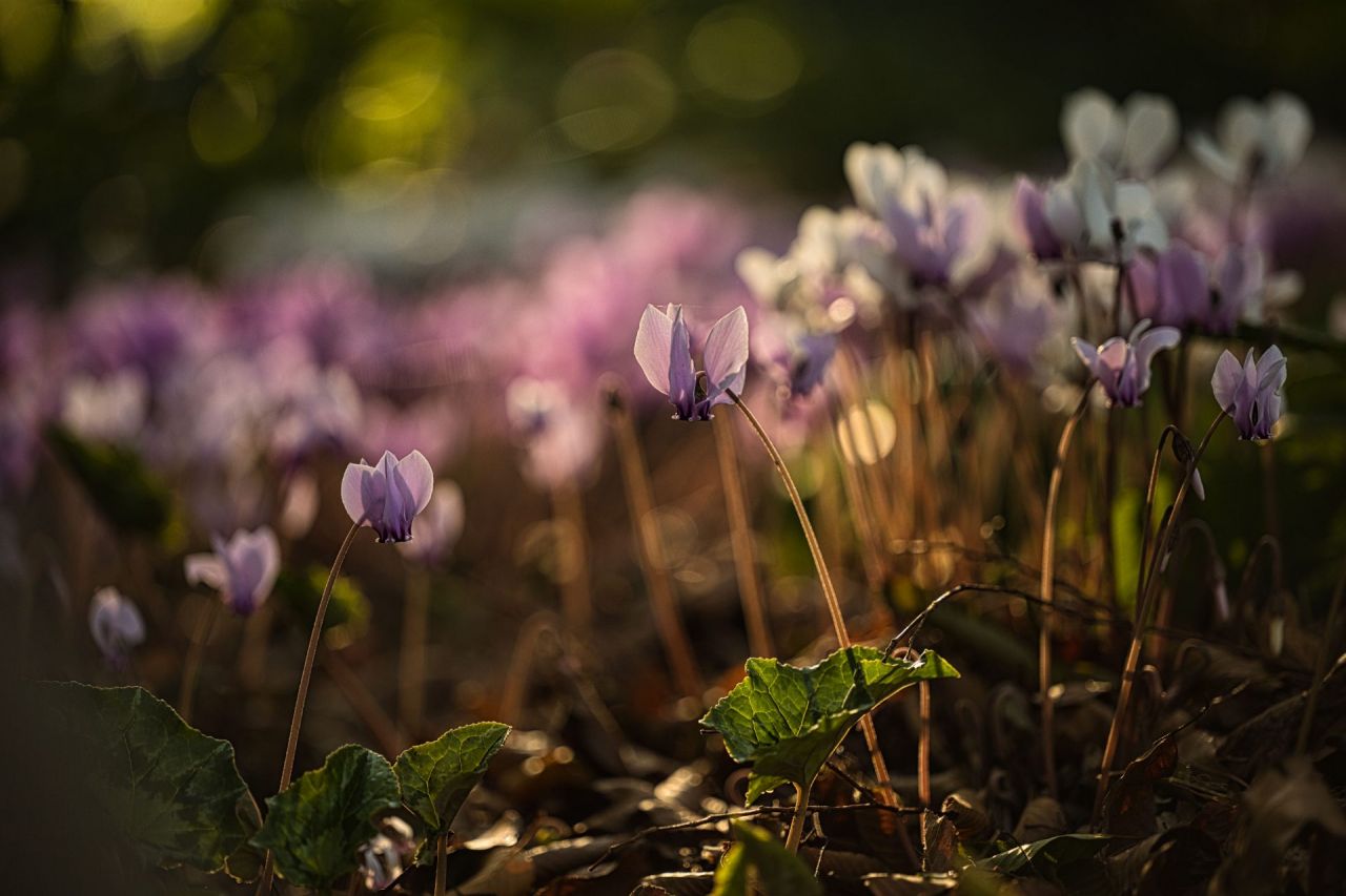 De herfstbloeiende Cyclamen hederifolium groeit liefst onder loofbomen, want ze willen graag veel vocht en licht in de winter en veel droge schaduw in de zomer. Deze soort start met bloeien wanneer de eerste regen na een droge zomer het najaar aankondigt. Dan verschijnen op lange buigzame stelen de roze of witte samengevouwen bloempjes. Sommigen zien er hartjes in, anderen vlinders. Ze bloeien nog voordat hun donkergroene en zilveren bladeren verschijnen en de ondergrond toedekken als een bed.